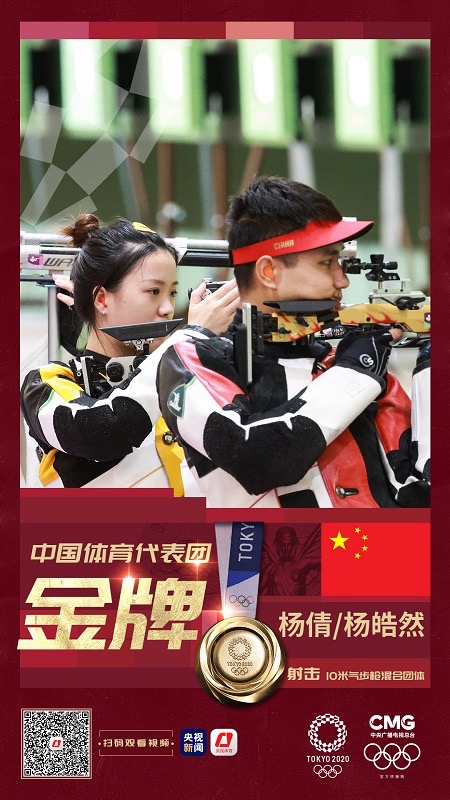 7月27日,中国组合杨皓然/杨倩获得东京奥运会十米气步枪混合团体金牌。这是中国代表团在此次奥运会中获得的第9枚金牌。
