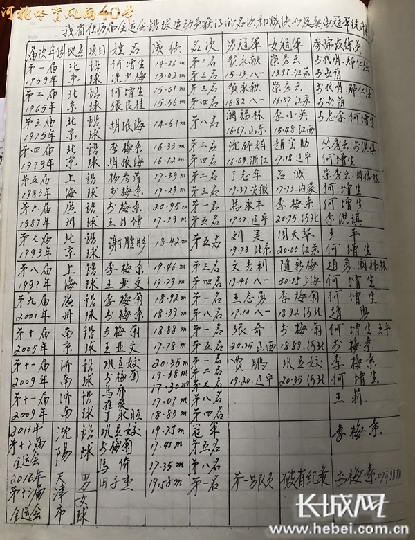 一双宽厚的大手、魁梧的身形……记者见到何增生教练时,他正在家中书桌前翻看自己执教时留下的笔记本。虽然已经80岁高龄,但何增生教练依然声如洪钟,思维敏捷。翻开他手中的笔记本,密密麻麻记录着自1974年以来女子铅球各类大赛的成绩,省运会、亚运会、世锦赛、奥运会……应有尽有,统计内容包括每位成人论坛 的名次和成绩,十分详细。何增生教练告诉记者,这些笔记本里记录着他长达38年的执教生涯,也“藏着”河北女子铅球成绩在亚洲长期保持领先的秘密。